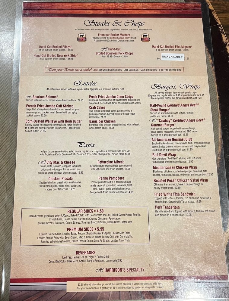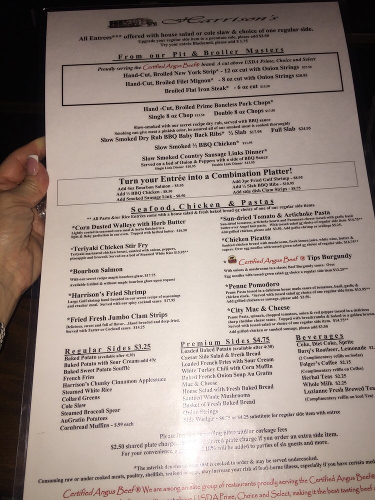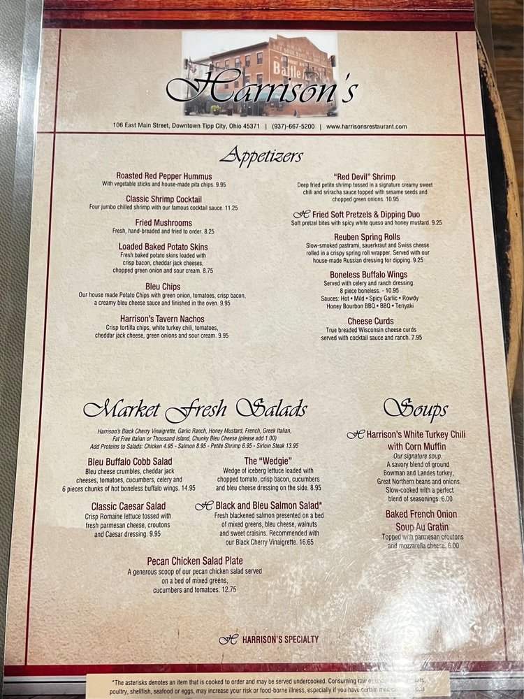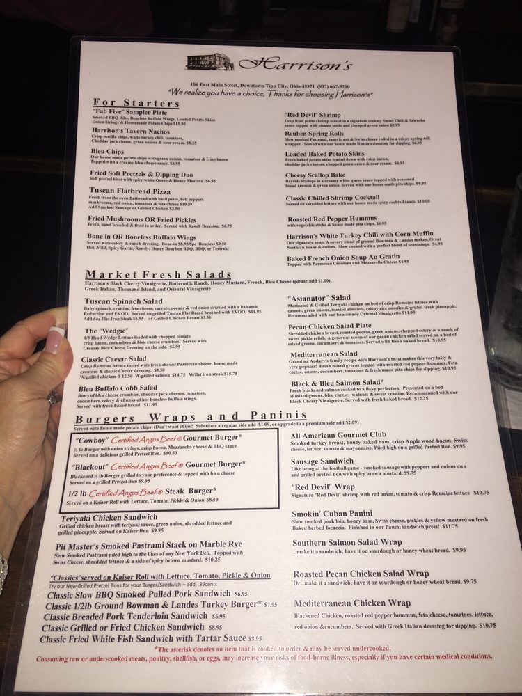 Located in Tipp City, OH, Harrison's is a popular dining spot known for its New American cuisine and classy yet casual ambiance. Offering a variety of vegetarian options, this venue is perfect for any occasion, from group gatherings to family dinners. Customers rave about the delicious food, friendly service, and cozy atmosphere. Standout dishes like Walleye, Creme Brulee, BBQ pork chop, Black and Blue Salmon salad, and cabbage rolls have left diners impressed with their flavors and preparation. The menu also features appetizers like French Onion Soup and Chicken Noodle Soup, along with entrees like Buffalo Cob Salad and Angus Steak Burger. With a full bar, outdoor seating, and free Wi-Fi, Harrison's provides a memorable dining experience that keeps guests coming back for more. Whether you're a local or just passing through, Harrison's is a must-visit destination for food enthusiasts.